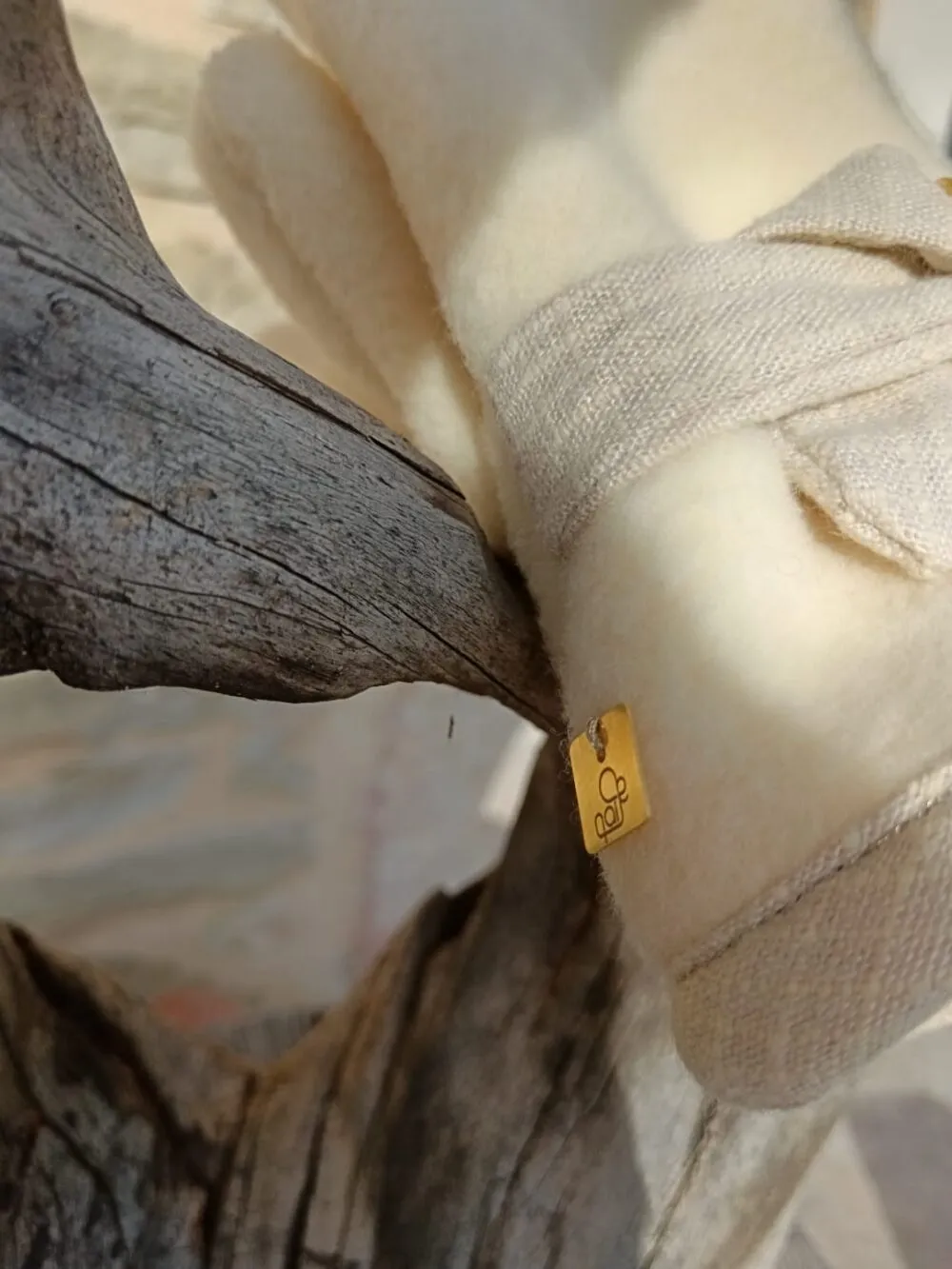 Moufles moelleuses en polaire mérinos d’Arles et biais ripstop chanvre et laine cousu au fil doré.